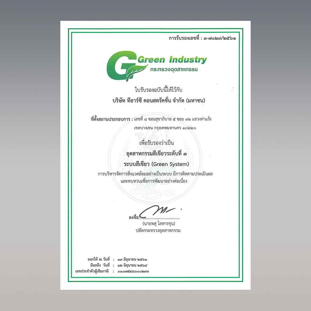 On 13 June 2018, TRC Construction Public Company Limited has been certified “Green Industry Level 3: Green System" from Ministry of Industry, indicating TRC shall have either systematic environmental management (including monitoring, assessment and review for continuous improvement) including well-recognized environmental management award and certificate. Green Industry Award : Level 3 (Green System)